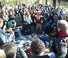 The memorial is often covered with flowers, candles in glasses, and other belongings left behind by Lennon's fans. On Lennon's birthday (October 9) and on the anniversary of his death (December 8), people gather to sing songs and pay tribute, staying late into what is often a cold night. The tributes usually run all night, but for a period through the late 1990s and early 2000s, mayor Rudy Giuliani enforced a curfew, which prohibited people from being inside Central Park after it closed each day at 1:00 a.m.[10][11] Gatherings also take place on the birthdays of other Beatles. Impromptu memorial gatherings for other musicians, including Jerry Garcia and George Harrison, have occurred at the memorial. In the days following the September 11 attacks, candlelight vigils were held at the Imagine Circle to remember those killed.