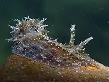 Stylocheilus striatus is a species of sea hare found in the Indo-pacific region living from the intertidal zone to a depth of 30 metres. Common names include lined sea hare, blue ring sea hare and furry sea hare.[2] Mature animals can reach sizes of up to 65 mm in length and are brown in colour with blue spots. Their diet mainly consists of blue algae. They play an important role in controlling toxic blooms of the cyanobacterium Lyngbya majuscula.[3]