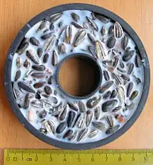 Next to balls, which are predominantly common in Northern and Central Europe, suet cakes may take various shapes such as rectangles, rings, or wheels.[2] Fat balls are often sold within a fine plastic net allowing their suspension, such as on branches or in bushes. The nets can, however, be a danger to other species, such as deer, who may find the balls and eat them whole.[3] Other forms of suet cakes can be placed within suspendable cages.[2]