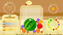 Suika Game is puzzle game focusing on stacking objects in a confined space, reminiscent to Tetris.[4] The player is tasked with dropping a wide range of fruits in a box and aim for the highest score without having a single fruit cross the line at the top of the box and overflowing out, or else the game would end.[5] In order to keep the fruits from overflowing out of the box, the player must match two types of fruits in order for them to merge into the next biggest fruit in the cycle, increasing the player's score. The bigger the fruits that merge the larger the point bonus is, with the largest merge the player can achieve is creating the titular suika/watermelon.[6] If two watermelons merge, they disappear from the box.[7] Suika Game has no time limit to rush the player with;[8] but unlike with games like Tetris, the fruits are affected by physics causing them to hit off each other and roll away from where they were initially dropped.[9] Sometimes the pressure released by two fruits merging can send a fruit out the box and ending the game.[10][11]
