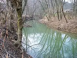 Sunday Creek is a tributary of the Hocking River, 27.2 miles (43.8 km) long, in southeastern Ohio in the United States. Via the Hocking and Ohio Rivers, it is part of the watershed of the Mississippi River, draining 139 square miles (360 km²) in a mainly rural area of the Allegheny Plateau region.[7] Its name is locally said to derive from early white settlers who in 1802 reached the creek on a Sunday, and so named it after the day of their discovery.[8] (also see nearby Monday Creek.)