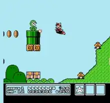 Super Mario Bros. 3 is a two-dimensional, side-scrolling platform game in which the player controls either Mario or Luigi. The game shares similar gameplay mechanics with previous games in the series — Super Mario Bros., Super Mario Bros. 2 in Japan, and Super Mario Bros. 2 internationally — while introducing several new elements. In addition to the running and jumping found in previous games, the player character can slide down slopes, pick up and throw certain items, and freely climb vines. New power-ups are introduced, including the Super Leaf and the Tanooki Suit, which allow Mario to fly and float.[6] The game world consists of eight kingdoms, each subdivided into multiple levels. The eight worlds feature distinct visual themes: for example, the second world, "Desert Land" (or "Desert Hill" in Japanese and North American PRG0 versions), contains sand-covered levels with pyramids, while the levels in the fourth world, "Giant Land" ("Big Island"), contain obstacles and enemies twice their normal height and width.[7]