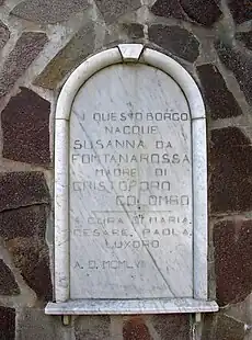 The inscription reads Susanna Fontanarossa, the mother of Christopher Columbus, was born in this village.
