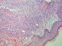 Sweet syndrome (SS), or acute febrile neutrophilic dermatosis,[1][2] is a skin disease characterized by the sudden onset of fever, an elevated white blood cell count, and tender, red, well-demarcated papules and plaques that show dense infiltrates by neutrophil granulocytes on histologic examination.