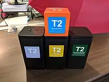 T2, officially registered as Tea Too, is a chain of specialty tea shops with stores in Australia, Singapore, and New Zealand. The company was established in Melbourne, Australia in 1996, and was purchased by Unilever in 2013.[2] In 2013, T2 had 40 stores across the globe and made an annual turnover of A$57 million.[3]