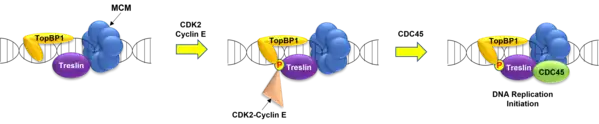 Human TOPBP1 is required for the initiation of DNA replication through its association with the proteins Treslin, CDC45, and RecQ4. In yeast, the TOPBP1 homologue Dpb11 has been shown to recruit DNA polymerase ε (Polε) and the GINs complex to the origin of replication which has been pre-loaded with the minichromosome maintenance (MCM) complex. It accomplishes this by binding to Sld2 (Polε associated factor) and Sld3 (CDC45 associated factor) in a cyclin dependent kinase (CDK) phosphorylation dependent manner. This leads to the formation of the pre-initiation complex, i.e. the CDC45–MCM–GINS (CMG) replicative helicase. In summary, TOPBP1 acts as a scaffolding protein that facilitates the interactions necessary to form the DNA replication pre-initiation complex. In humans the mechanism is not fully understood yet, but TOPBP1 interacts with RecQ4 (Sld2) and Treslin (Sld3).[10][19]
