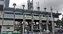 The entrance to the square has gigantic sculptures of four white horses hovering above the gate and seven red eagles, which are symbols from the national emblem signifying Strength and Dignity respectively. Other monuments in the square include the Remembrance Arcade (with memorials to World War I, World War II and Nigerian civil war victims) and the 26-storey Independence House, built in 1963 which was for a long time, the tallest building in Nigeria.[1]