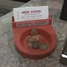 The small cup or tray near a cash register is designated as a place for people to place pennies they receive as change if they do not want these pennies. Then, customers who, for example, need one cent for a transaction can take one of the pennies to avoid needing one of their own or breaking a higher-denomination coin or bill. The tray can also be used by cashiers for the sake of efficiency: the cashier may take a penny (1 cent) from the tray and then give the customer, for example, one quarter (25 cents) instead of 24 cents (two dimes and four pennies, or six coins in all).[1] These are also called "penny pools", and may be either a generic container such as a small box, or a purposely made container, perhaps with an advertisement or with text advising the customer to "take a penny, leave a penny".[2]