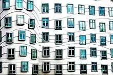 The style is known as deconstructivist ("new-baroque" to the designers) architecture due to its unusual shape. The "dancing" shape is supported by 99 concrete panels, each a different shape and dimension. On the top of the building is a large twisted structure of metal nicknamed Mary.