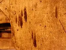 Taper burn marks are deep flame shaped scorch marks often found on the timber beams of early modern houses.[1] They were originally thought to have been accidental scorches from a taper candle, but research suggests that most marks may have been made deliberately, as there is clear patterning of the activity.[2] They are theorised to have been made as part of a folk superstition, then thought to protect the building from fire and lightning.[1]