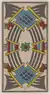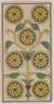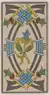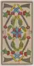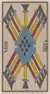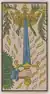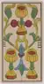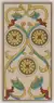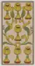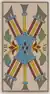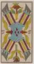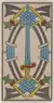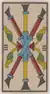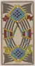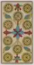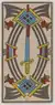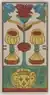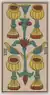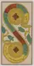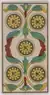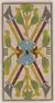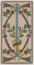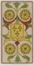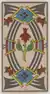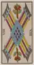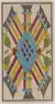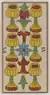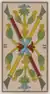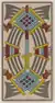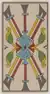 In the Tarot de Marseille, as is standard among Italian suited playing cards, the pip cards in the suit of swords are drawn as abstract symbols in curved lines, forming a shape reminiscent of a mandorla. On the even numbered cards, the abstract curved lines are all that is present. On the odd numbered cards, a single fully rendered sword is rendered inside the abstract designs. The suit of batons is drawn as straight objects that cross to form a lattice in the higher numbers; on odd numbered baton cards, a single vertical baton runs through the middle of the lattice. On the tens of both swords and batons, two fully rendered objects appear imposed on the abstract designs.[6] The straight lined batons and the curved swords continue the tradition of Mamluk playing cards, in which the swords represented scimitars and the batons polo mallets.[7]