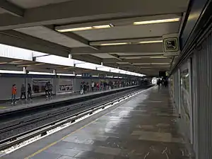Tasqueña (sometimes also spelled Taxqueña) is a station on Line 2 of the Mexico City Metro system.[2] It is located in the Campestre Churubusco neighborhood, within the Coyoacán borough of Mexico City, directly south of the city centre on Avenida Tasqueña and Canal de Miramontes.[2] It is a surface station and the southern terminus of the line.[2] In 2019, the station had an average ridership of 83,463 passengers per day, making it the seventh busiest station in the network.[3]