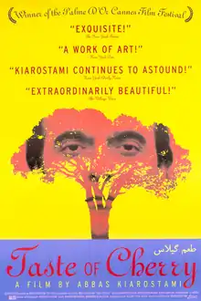 Taste of Cherry (Persian: طعم گیلاس..., Ta’m-e gīlās...) is a 1997 Iranian minimalist drama film written, produced, edited and directed by Abbas Kiarostami, and starring Homayoun Ershadi as a middle-aged Tehran man, who drives through a city suburb, in search of someone willing to carry out the task of burying him after he commits suicide. The film won the Palme d'Or at the 1997 Cannes Film Festival, which it shared with The Eel.