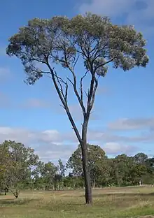 Dense acacia forests or 'brigalow scrub' encompass 30% of the parks area, with species typical of the endangered Brigalow shrubland/forest ecosystem described previously, or can include combinations of A. harpophylla with dawson gum or poplar box.[3] The most dominant vegetation association, covering 39% of the parks area, is the grassy eucalypt woodlands which are dominated by poplar box in combination with the silver-leaved ironbark (E. melanophloia), the narrow-leaved ironbark, (E. crebra), the long-fruited bloodwood (E. polycarpa) and the grey box (E. moluccana).[3][13] The transitional zones between the Acacia dominated forests and Eucalpyt dominated woodlands are composed of combinations of characteristics particular to each ecosystem type, and only contribute to 14% of the parks total area.[3] The remaining land was previously cleared and is undergoing natural regeneration, primarily by A. harpophylla.[3]