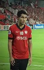 Teerasil Dangda (Thai: ธีรศิลป์ แดงดา, pronounced [tʰīː.rā.sǐn dɛ̄ːŋ.dāː]; born 6 June 1988) is a Thai professional footballer who plays as a striker for Thai League club BG Pathum United and captains the Thailand national team.[1]