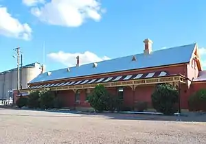 Temora railway station is on the Lake Cargelligo railway line. It opened in 1893.[14] The station had a traditional role as a transfer point for passenger services to Hillston, Lake Cargelligo, Rankin Springs, Burcher and Naradhan, most of which were withdrawn in the late 1970s. The station is not presently served by passenger services however remains an important signalling facility, is used as a stop by the Lachlan Valley Railway[27] and is currently being restored by Temora Shire Council for use a tourist and youth facility.[28]