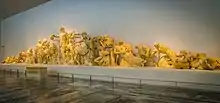 The Eastern pediment depicts the chariot race between Pelops and Oenomaus, while the Western pediment features a Centauromachy with Theseus and the Lapiths. The god Apollo is featured on the western pediment pointing towards the human side in the Centauromachy, indicating his favor, and towards the northern side of the temple.[9] Pausanias reports in his Description of Greece (5.10.8) that the Eastern pedimental sculpture was created by Paeonius and the Western sculpture was carved by Alcamenes.[10] The metopes from the temple depict the twelve labours of Heracles.