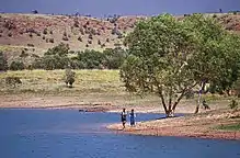 The brief wet season is very hot, moderately rainy, and experiences higher humidity than the rest of the year.[5] The prevailing winds are from the Arafura Sea, but the large size of the Northern Territory's Top End reduces the amount of precipitation in communities further inland, such as Tennant Creek, and contributes to the season's high amount of sunshine. The moderating influence of the ocean is greater during this season, as temperature swings are not as severe as the rest of the year. Extremes range from a minimum of 15.7 °C (60.3 °F) to a maximum of 45.6 °C (114.1 °F). Additionally, over 70% of Tennant Creek's 494.7 mm (19.48 in) of annual precipitation occurs during this season,[6] and contributes to being in the Tropical Thorn Woodlands biome under the Holdridge Life Zones classification.[7] Occasionally, flooding can pose a major risk in the area, such as during January 2022, where one person drowned in floodwaters at Seven Mile Bridge, to the north of Tennant Creek.[8]