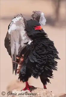 Bateleurs seem to devote an exceptional amount of time to thermoregulation frequently spending much of its day variously sunning, to warm up, and bathing, to cool off.[34] These eagles are frequently seen to enter water-bodies for a bath and then open their wings to often sunbathe. Standing upright and holding their wings straight out to the sides and tipped vertically, a classic 'phoenix' pose as they turn to follow the sun.[74] Bateleurs will stand on the ground with their wings spread, exposing the feathers to direct sunlight, warming the oils in the feathers. The bird will then spread the oils with its beak to improve its aerodynamics. In some countries, local nicknames of the species may include as the "Conifer eagle" or "Pine eagle" due to its feathers resembling a conifer cone when fluffed up and engaging in thermoregulatory behaviour.[75][76][77] At times, this is described as a “striking heraldic posture”.[7] Bateleurs may also be seen "praying" allowing ants to crawl over the wings and feathers, collecting bits of food, dead feather and skin material. When covered in ants, the bateleur then ruffles its feathers, startling the ants, which react by secreting formic acid as self-defence. This in turn kills the ticks and fleas, possibly ridding the host of its parasites.[78]