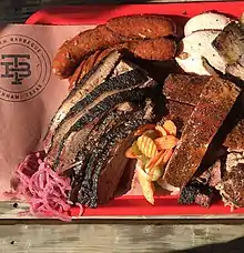 Texas is among a handful of states that developed an early preference for beef barbecue, alongside other states in the neighboring cuisine of the Southwestern United States and the cuisine of the Western United States.[5] Beef brisket (slowly cooked in smoke in a wood-fired "pit") is the most common barbecue.