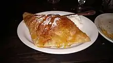 Sopapillas are a simple fried pastry dough sweetened with sugar and cinnamon.[9] The dish has roots in a lard-fried pastry made by the Tigua Pueblo and Franciscan friars from New Mexico in Ysleta, El Paso. This early form of the pastry dates to at least 1682, as the style originates in New Mexican cuisine, making it one of the earliest pastries known found in Texan cuisine.[8]