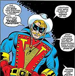Texas Twister first appeared in Fantastic Four #177 (December 1976), and was created by writer Roy Thomas and penciller George Pérez.[1] One year later, with writer Don Glut and penciller John Buscema, Roy Thomas further developed his creation in Captain America #217 (January 1978). Texas Twister became a member of S.H.I.E.L.D. Super-Agents. This team was also depicted in the next issue of Captain America written by Don Glut and drawn by Sal Buscema.[2] Writers Roger Slifer and Len Wein used the cowboy character and made him an opponent of the Human Torch in Fantastic Four #192 (March 1978). The issue was drawn by his cocreator George Pérez. The S.H.I.E.L.D. Super-Agents reappeared in Captain America #228-229 (December 1978 - January 1979), written by Roger McKenzie and drawn by Sal Buscema. Texas Twister appeared in a flashback in the story "Aftermath" published in Captain America #231 (March 1979).