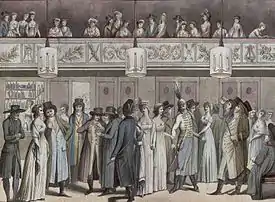 In October 1789 a revolutionary mob forcibly evicted the royal family from the Palace of Versailles and compelled them to move to Paris. Mademoiselle Montansier, who had been the manager of the theatre at Versailles, as well as several other court theatres, followed the king and queen. Needing a theatre near the court's new location at the Palais des Tuileries, and learning of Delomel's situation, she swiftly used her royal connections to acquire his lease. Delomel was evicted in January 1790, after which he transferred his troupe on 22 February to the Théâtre des Élèves de l'Opéra on the Boulevard du Temple, where eventually for lack of adequate receipts he was forced to close permanently on 7 March 1791. Under the name Théâtre Montansier, the theatre in the Palais-Royal reopened on 12 April 1790 with the three-act comic opera Les Epoux mécontents (Gli sposi malcontenti) with music by Storace and a new libretto by Dubuisson.[10] On 30 September the company presented the play Le Sourd, ou L'Auberge pleine, a 3-act comedy by P. J. B. Desforges. It was a major success becoming the most performed play of the Revolution with over 450 performances, 251 at Montansier's theatre alone, where it eventually earned around 500,000 francs, a substantial amount of money for the time.[11] The theatre began presenting Italian operas in French translation, successfully competing with, and gaining the enmity of the Opéra which had been exiled at the suburban Théâtre de la Porte Saint-Martin since 1781.[12][13]