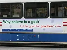 In 2008 it ran ads on buses in Washington, D.C., that proclaimed "Why believe in a god? Just be good for goodness' sake",[39] and since 2009 the organization has paid for billboard advertisements nationwide.[40] One such billboard, which stated "No God...No Problem" was repeatedly vandalized.[41]