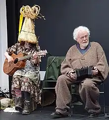 The Armagh Rhymers group was founded in the 1970s by Dara Vallely,[3] and is one of the few groups on the island of Ireland preserving the tradition of rhyming and mumming.[4][5] The group perform using woven flax, willow, and straw masks,[4] inspired by the traditional Mummers' masks with outfits mostly made from hessian sackcloth. They incorporate storytelling, music, poetry and song into their performances.[6]