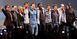 Casting began in October 2008 with Downey's signing.[12] Though Don Cheadle was also reported to be reprising his Iron Man 2 role of War Machine for The Avengers, he later stated that he did not think the character would appear in the film.[12][64] At the same time, two major prospects occurred for Marvel: Jon Favreau was brought in as an executive producer for the film,[12] and the company signed a long-term lease with Raleigh Studios to produce three other big-budget films—Iron Man 2, Thor, and Captain America: The First Avenger (2011)—at their Manhattan Beach, California complex.[65] In February 2009, Samuel L. Jackson signed a nine-picture deal with Marvel Entertainment to play Nick Fury in Iron Man 2 and other films.[38] In September 2009, Edward Norton, who played Bruce Banner in The Incredible Hulk stated that he was open to returning in the film.[66] The next month, executive producer Jon Favreau stated that he would not direct the film, but would "definitely have input and a say". Favreau also expressed concerns, stating, "It's going to be hard, because I was so involved in creating the world of Iron Man, and Iron Man is very much a tech-based hero, and then with Avengers you're going to be introducing some supernatural aspects because of Thor [...] [Mixing] the two of those works very well in the comic books, but it's going to take a lot of thoughtfulness to make that all work and not blow the reality that we've created".[67] In March 2009, actress Scarlett Johansson replaced Emily Blunt in portraying Natasha Romanoff in Iron Man 2, a deal that subsequently attached her to The Avengers.[29] The following day, Marvel announced that the film's release date had been pushed back to May 4, 2012, almost a full year later.[68] Chris Hemsworth and Tom Hiddleston joined the film's cast in June, returning as Thor and Loki, respectively.[26]