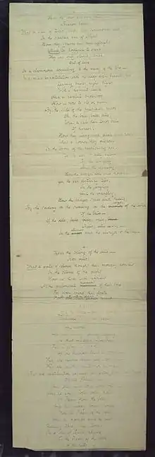 The sounds of the verses, specifically the repetitive "bells, bells, bells, bells, bells, bells, bells," lie on a narrow line between sense and nonsense, causing a feeling of instability.[2] Poe uses - and popularised - the word "tintinnabulation", often wrongly thought to be his own coinage,[3] based on the Latin word for "bell", tintinnabulum.[4] The series of "bells" echo the imagined sounds of the various bells, from the silver bells following the klip-klop of the horses, to the "dong, ding-dong" of the swinging golden and iron bells, to screeching "whee-aaah" of the brazen bells. The series are always four, followed by three, always beginning and ending on a stressed syllable. The meter changes to iambic in the lines with repeated "bells," bringing the reader into their rhythm. Most of the poem is a more hurried trochaic tetrameter.[5]