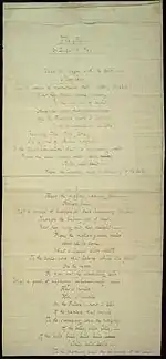Inspiration for the poem is often granted to Marie Louise Shew, a woman who had helped care for Poe's wife Virginia as she lay dying.[12] One day, as Shew was visiting Poe at his cottage in Fordham, New York, Poe needed to write a poem but had no inspiration. Shew allegedly heard ringing bells from afar and playfully suggested to start there, possibly even writing the first line of each stanza.[14]