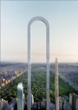 The Big Bend was designed by Ioannis Oikonomou of the architecture firm Oiio Studio. The proposal is most known for its distinctive U-shape, which would make it the longest building in the world, though not the tallest, were it built.[1] It would have a length of 4,000 feet (1,200 m) from one base to the top of the building to the other base.[1] The proposal is a very tall and slender building, with a peak height above the ground that would be more than 1,969 feet (600 m).[2][3] This would make it a megatall building, as well as the tallest building in New York City, surpassing One World Trade Center by 200 feet (61 m).[2]