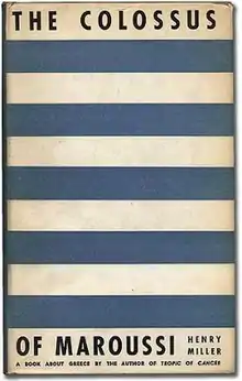 The Colossus of Maroussi is an impressionist travelogue by American writer Henry Miller that was first published in 1941 by Colt Press of San Francisco. Set in pre-war Greece of 1939, it is ostensibly an exploration of the "Colossus" of the title, George Katsimbalis, a poet and raconteur. The work is frequently heralded as Miller's best.