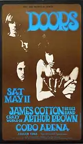 From February to May 1966, the group had a residency at the "rundown" and "sleazy" Los Angeles club London Fog, appearing on the bill with "Rhonda Lane Exotic Dancer".[26] The experience gave Morrison confidence to perform in front of a live audience, and the band as a whole to develop and, in some cases, lengthen their songs and work "The End" and "Light My Fire" into the pieces that would appear on their debut album.[26] Manzarek later said that at the London Fog the band "became this collective entity, this unit of oneness ... that is where the magic began to happen."[26] The group soon graduated to the more esteemed Whisky a Go Go, where they were the house band (starting from May 1966), supporting acts, including Van Morrison's group Them.[27] On their last night together the two bands joined up for "In the Midnight Hour" and a twenty-minute jam session of "Gloria".[28][29]