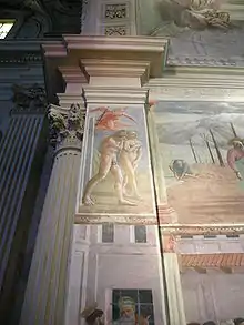 The Expulsion from the Garden of Eden (Italian: Cacciata dei progenitori dall'Eden) is a fresco by the Italian Early Renaissance artist Masaccio. The fresco is a single scene from the cycle painted around 1425 by Masaccio, Masolino and others on the walls of the Brancacci Chapel in the church of Santa Maria del Carmine in Florence. It depicts the expulsion of Adam and Eve from the garden of Eden, from the biblical Book of Genesis chapter 3, albeit with a few differences from the canonical account.[1]
