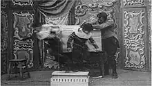 Méliès plays the magician in the film, which also uses pyrotechnics in its effects.[3] The style is highly theatrical, with camera tricks only beginning around halfway through, and particularly reminiscent of Méliès's earlier The Vanishing Lady (1896).[4] The film's use of American and British flags as props reflects international interest in Méliès's films; by 1898, Méliès had found the United States and United Kingdom to be important markets for his work.[1]