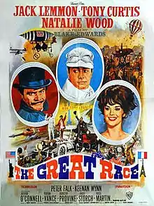 The Great Race is a 1965 American Technicolor epic slapstick comedy film starring Jack Lemmon, Tony Curtis, and Natalie Wood, directed by Blake Edwards, written by Arthur A. Ross (from a story by Edwards and Ross), and with music by Henry Mancini and cinematography by Russell Harlan. The supporting cast includes Peter Falk, Keenan Wynn, Arthur O'Connell and Vivian Vance. The movie cost US$12 million (equivalent to $98.36 million in 2020), making it the most expensive comedy film at the time.[2] The story was inspired by the actual 1908 New York to Paris Race.[3]