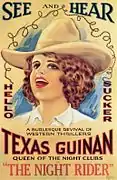 In a film career that began in 1917 and continued through 1933, she was part of the vanguard of women filmmakers in the United States. Her later claims of being in France in 1917 entertaining the troops, and being decorated with a bronze medal by French field marshal Joseph Joffre, have been proven false by the timeline and California location of her prolific film-making.[24][25] Triangle Film Corporation, founded in 1915 by Harry Aitken and Roy Aitken, featured Guinan in four two-reel shorts between 1917 and 1918, The Fuel of Life, The Stainless Barrier, The Gun Woman and The Love Brokers. Unlike the musical genre she was known for on stage, she was now moving towards the Western movie genre, and on her dressing room door appeared a map of the state of Texas, rather than her name. Triangle began billing her as "the female Bill Hart" in reference to the industry's first Western star who at that time topped fandom popularity polls.[26]