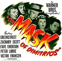 The Mask of Dimitrios is a 1944 American film noir starring Sydney Greenstreet, Zachary Scott, Faye Emerson, Peter Lorre, and Victor Francen. Directed by Jean Negulesco, it was written by Frank Gruber, based on the 1939 novel of the same title written by Eric Ambler.[1] Scott played the title role, of Dimitrios Makropoulos, in his film debut.