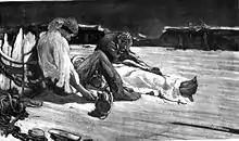 The storm increases in force, breaking the mast, tearing the sails and flooding the hold. All four manage to survive by lashing themselves to the hull. As the storm abates, they find themselves safe for the moment, but without provisions. Over the following days, the men face death by starvation and thirst.
