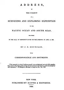 In order to present the tale as an authentic exploration, Poe drew from contemporary travel journals.[1] Poe's most significant source was the explorer Jeremiah N. Reynolds,[2] whose work Address on the Subject of a Surveying and Exploring Expedition to the Pacific Ocean and the South Seas was reviewed favorably by Poe in January 1837.[3] Poe used about 700 words of Reynolds' address in Chapter XVI, almost half the length of the chapter.[4] In 1843, Poe also praised Reynolds in a review of A Brief Account of the Discoveries and Results of the United States' Exploring Expedition printed in Graham's Magazine.[5] It is unknown whether Poe and Reynolds ever met.[6] Shortly before Poe's mysterious death, he is said to have called out the name "Reynolds" in his delirium. If true, this may have reflected the influence of Jeremiah Reynolds.[7]