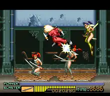 The player can move along a single plane, with the stages typically going in a linear direction and ending with a boss.[5][6] Each character has a different set of moves which include speed dashes, jumps, grabs, blocks, and a variety of attack moves. There is a power meter that increases slowly with time that, when full, lets the player trigger a powerful attack that damages all enemies on the screen. The meter drains completely if the player is knocked to the ground.[5] Some items, such as motorcycles and large safes, can be picked up and tossed at enemies. The environments occasionally introduce hazards that can hurt the player as well as enemies, such as mine fields or armed helicopters.[6] The Ninja Warriors has eight stages and unlimited continues. The player character can be changed when using a continue.[5][6]
