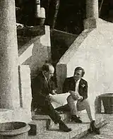 In the spring of 1914, Lubin staff writer and editor Lawrence McCloskey was assigned by the company to develop a special screenplay for Raymond Hitchcock and to convince him to star in it. McCloskey proceeded and composed a rough draft or '"skeleton'" of The Ringtailed Rhinoceros in just a week.[7] He then personally visited Hitchcock at "Bellemond", the comedian's estate outside New York City, on Long Island.[lower-alpha 4] There he read the draft to Hitchcock and his wife, actress Flora Zabelle.[7] Both performers agreed that the proposed plot was indeed unique, and they expressed a willingness to consider working in such a production. After incorporating Hitchcock and Zabelle's ideas into his script, McCloskey spent another week polishing and finalizing the scenario. The couple then committed to the project.[7]