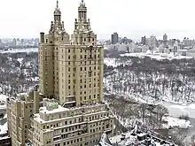 The building was completed on September 21, 1930.[24] The developers advertised the San Remo as "The Aristocrat of Central Park West".[19][23] Almost immediately, the San Remo experienced financial issues, despite critical acclaim in the architectural media.[76] The surrounding area had suffered after the Wall Street Crash of 1929, and shantytowns were built directly across the street from the San Remo during the Great Depression.[42] After the Bank of United States experienced a bank run in December 1930,[77] it shut down and its top officials were charged with recklessly using depositors' funds for speculation.[42][71] The New York State Banking Department took over the bank's holdings, including the San Remo's mortgage.[78] Early the next month, contractors placed $423,000 worth of liens against San Remo Inc.,[79] and the Bank of United States moved to foreclose on the building's $5 million mortgage loan.[80][81] Joseph Ravitch, head of HRH Construction, testified that the bank and its affiliates owed him $40,000 for the San Remo's construction.[74] In April 1931, a court-appointed receiver for the San Remo received permission to borrow $60,000 to pay the building's property taxes.[82][83]
