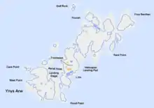 The name "Skerry" is the Scottish diminutive of the Old Norse "sker", and means a small rocky reef or island.[1] The Welsh name for these islands, 'Ynysoedd y Moelrhoniaid', means "Islands of the Seals".[2] An alternative name provided by some English-language sources is 'St Daniel's Isle'.[3]