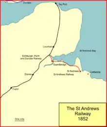 The St Andrews Railway was an independent railway company, founded in 1851 to build a railway branch line from the university town of St Andrews, in Fife, Scotland, to the nearby main line railway. It opened in 1852. When the Tay Rail Bridge opened in 1878 residential travel to Dundee was encouraged.