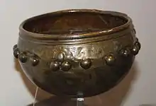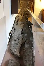 The exhibits include the metal "Glastonbury Bowl". It was made from two sections riveted together and repaired several times over its life. The bottom half has been dated as having been constructed in the Iron Age. The upper half was probably added in the 1st century from one sheet of metal, which may have been previously used for another purpose, and the two halves riveted together.[14][15] Other artefacts that form the village include a clay tuyère from a pair of bellows, whetstones, iron knives and iron currency bars, which could be used as tokens and exchanged for goods.[16][17] Some original storage jars are included in the displays which were re assembled by Arthur Bulleid, who discovered the site in 1892.[18][19] In the Tudor kitchen at the rear of the building is an Iron Age log canoe which was discovered near the lake village.