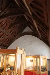 The building has two rooms and an attached kitchen on the ground floor with a staircase between them leading to the living quarters in the first floor rooms. The front room may originally have been a shop but was not used for trade after the installation of the new front wall in the 16th century.[6] The front room has recesses on either side of the arched fireplace.[7] The rear room on the ground floor was the hall and still has its 16th-century ceiling panels and four-light window. The ceiling has plaster decorations from the Elizabethan era, when the kitchen block was also added.[6][7]