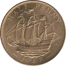 Although principally known as an obverse designer, Paget carried out some work for reverses, including, most famously, a design featuring the Elizabethan galleon the Golden Hind. Originally intended for the halfcrown, it was adopted for the halfpenny in 1937 where it remained until it was withdrawn in 1969 (in readiness for decimalisation in 1971).[4]